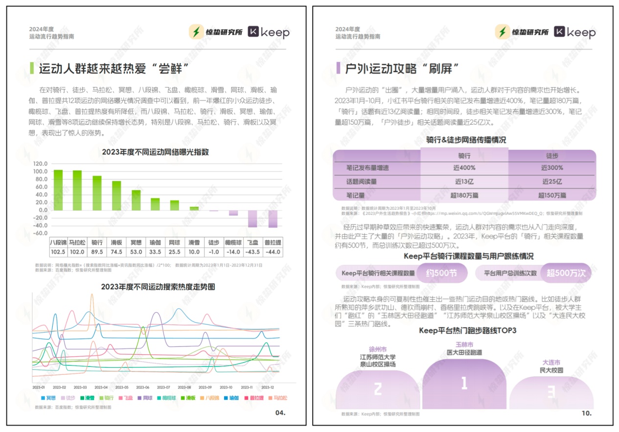 《2024年度运动流行趋势指南》披露,2023年是户外运动爆发的一年,骑行维持了前一年的热度,在网络曝光指数中稳居TOP3。而伴随着骑行热,运动人群对于内容的要求也在快速增长:2023年1月-10月,社交平台骑行相关的笔记发布量增速近400%,笔记量超180万篇,“骑行”话题阅读量近13亿。在这样的趋势下,骑行相关活动、赛事也愈发受欢迎。