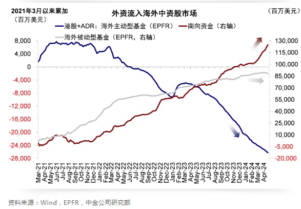 1) 外资方面,外资行上调中国市场和地产板块评级可能对投资者情绪有进一步提振,但是我们追踪的EPFR数据显示主动价值型资金尚未形成明确回流态势。截至上周三,EPFR海外主动型资金流出港股市场3.1亿美元,较此前一周流出4.2亿美元规模收窄,但已连续第43周流出。根据我们在《如何刻画并分析外资》中的拆解,交易型资金占比5%,主权和类政府背景资金占比10-20%,被动资金占比20%,主动价值型资金占比50%。因此更多可能以交易型资金为主,即使有部分配置型资金回流,可能也更多是为规避日央行加息和美股波动的对冲式切换,具有一定对冲和交易属性,因此是否能形成持续的流入尚难判断。