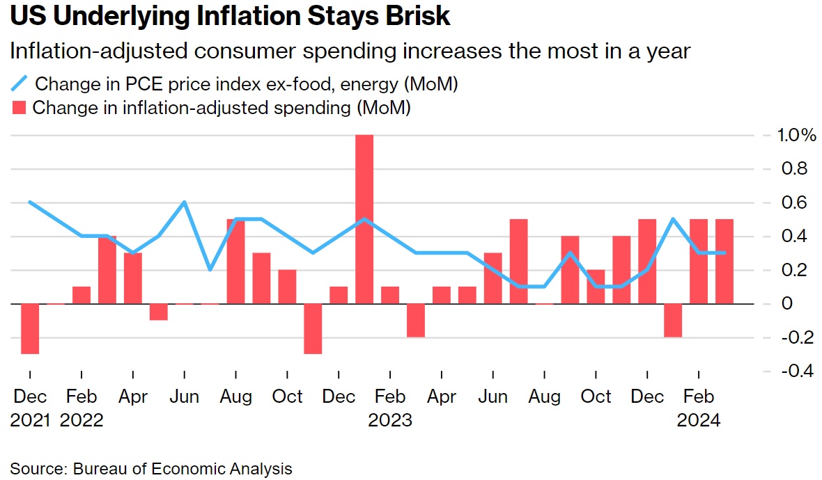 上周五公布的数据显示,美联储青睐的衡量美国潜在通胀的指标在3月份以轻快的步伐上升,这是连续第三个月令人失望的报告。在经历了2023年下半年的大幅下滑后,降低通胀的进展停滞不前,按照美联储偏爱的衡量标准,3月份的年通胀率为2.7%,剔除波动较大的食品和能源价格后略高。