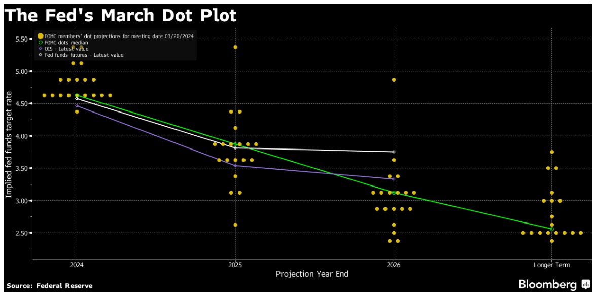 掉期交易员目前预计,美联储2024年全年只会降息一次,远低于他们在今年年初预计的大约6次25个基点的降息。FOMC将在6月11日至12日的会议上更新其利率预测。