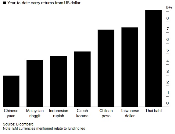 智通财经APP获悉,几十年来,套利交易者借助低利率美元投资于收益更高的新兴市场货币。然而,随着美联储持续的紧缩货币政策,这一趋势正在出现逆转,一些新兴经济体正努力维持其收益率的竞争力,成为了反向套利交易的目标。今年,借入新兴市场货币并购买美元的策略带来的回报率高达9%。