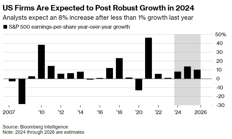 Bloomberg Intelligence汇编的数据显示,分析师们普遍预计,经过去年的低迷增长,标普500公司的整体每股收益在2024年将增长8%,在2025年则有望大幅增长14%,预计主要因美股的“七大科技巨头”(Magnificent 7)强劲业绩所驱动。