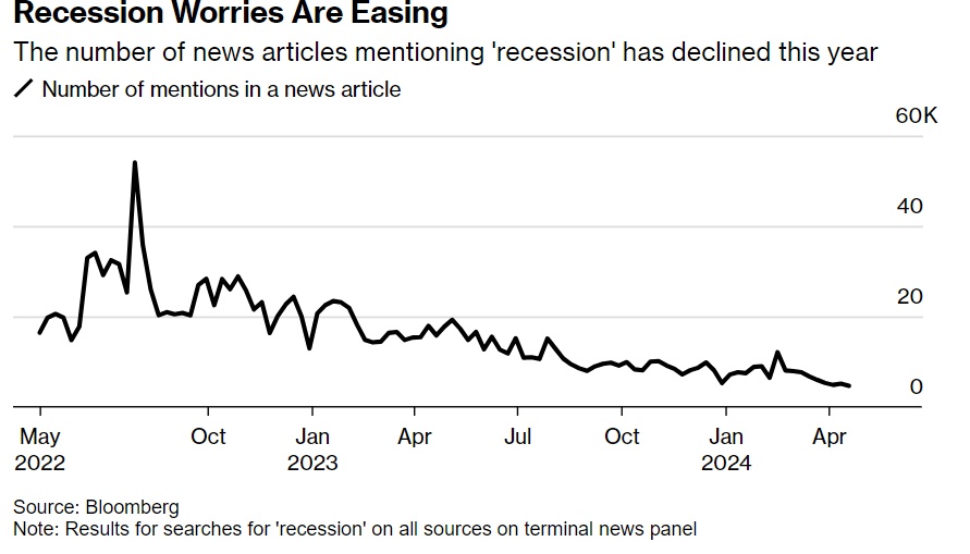 对经济衰退的担忧正在缓解——今年提到“衰退”的新闻报道数量有所减少