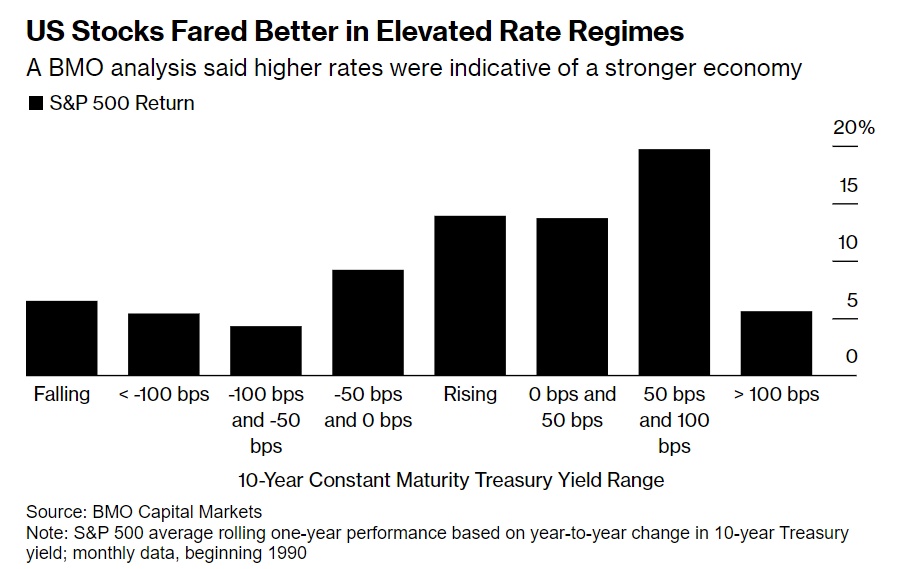 蒙特利尔银行资本市场(BMO Capital Markets)的一项分析显示,标普500指数的回报率竟然与较高的收益率息息相关,这一点令分析师们感到意外。分析显示,自1990年以来,当10年期美国国债收益率高于6%时,该指数的平均年化涨幅接近15%,而当收益率低于4%时,该指数的年化回报率则约为7.7%。