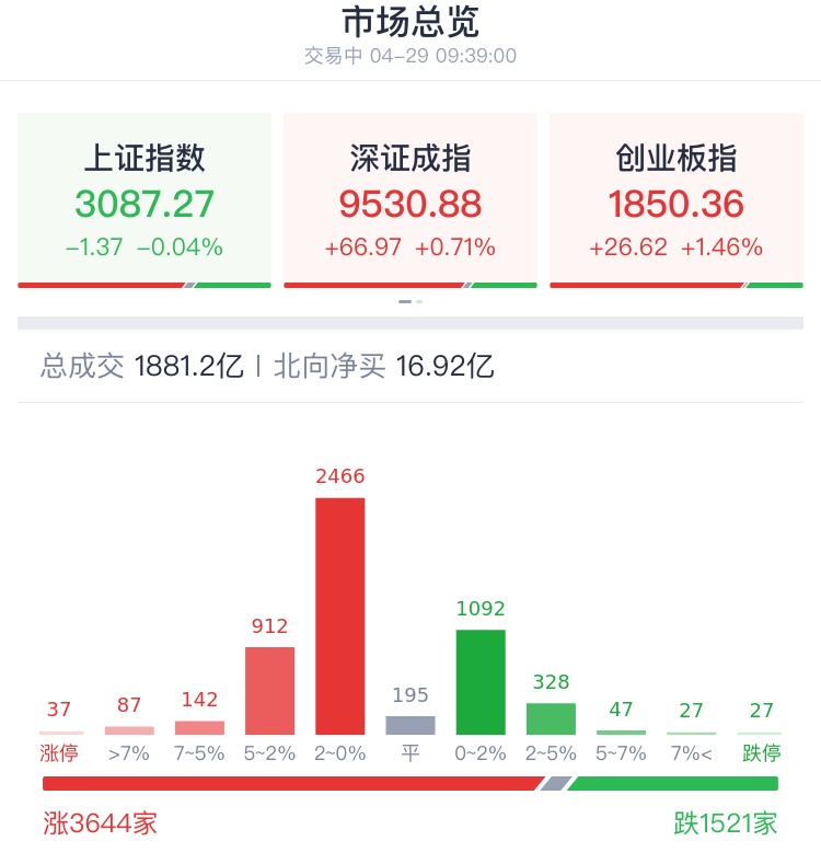 4月29日,A股早盘反弹延续,创业板大涨超1%。盘面上,机器人、汽车拆解、智能驾驶、AI赛道等方向涨幅居前,贵金属、煤炭等资源股继续走弱,教育、中字头等板块跌幅居前。