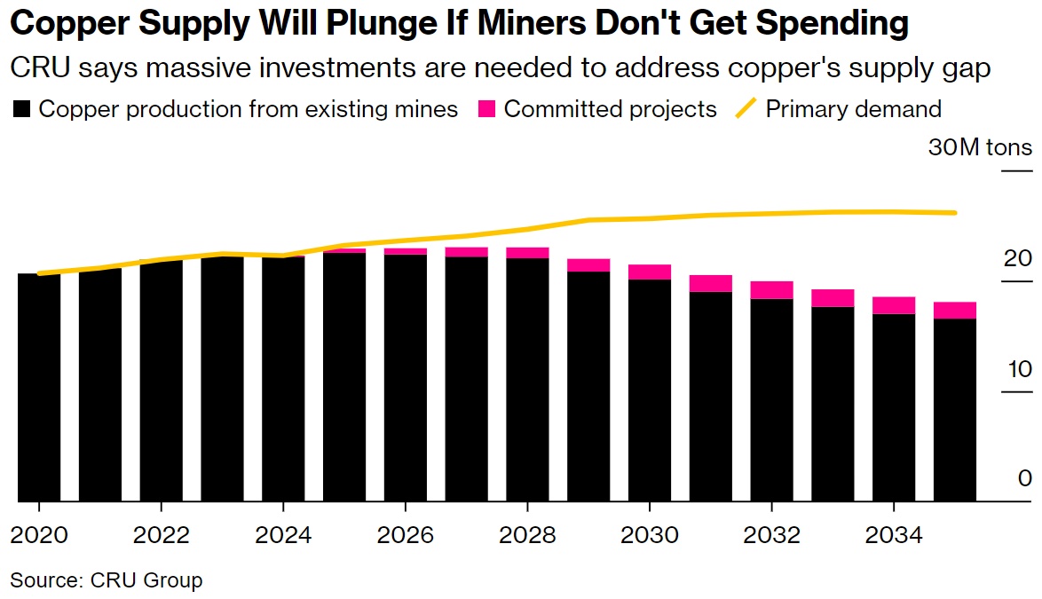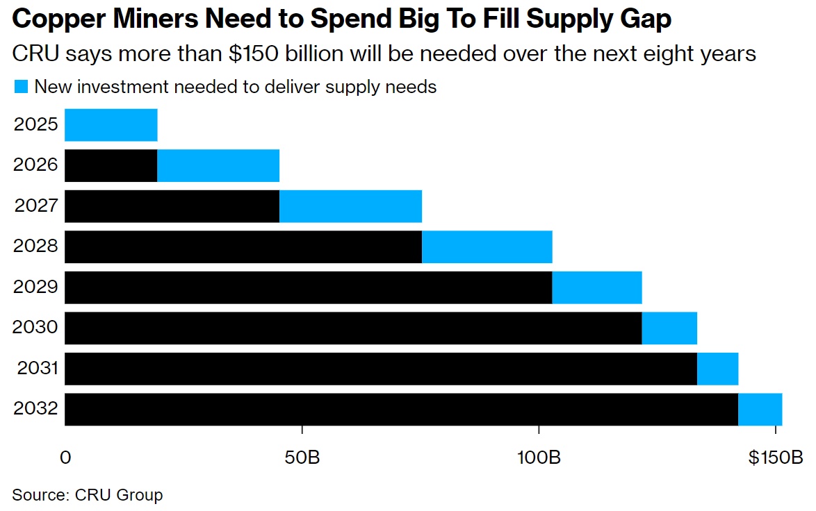 根据CRU Group的数据,现有矿山的产量将在未来几年大幅下降,为了满足该行业的供应需求,矿商将需要在2025年至2032年间花费超过1500亿美元。