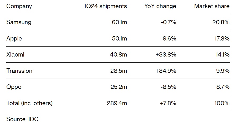 IDC统计数据显示,今年第一季度iPhone出货量大幅下降近10%,在全球智能手机行业整体出现明显反弹之际节节败退。IDC数据显示,全球手机市场出货量增至2.894亿部,较上年同期增长大约7.8%。其中,三星电子(Samsung Electronics)重夺榜首。主打预算的品牌传音(Transsion)出货量实现大幅增长85%,小米的第一季度数据也出现反弹,全面缩小了与排名第二的苹果(Apple)之间的差距。