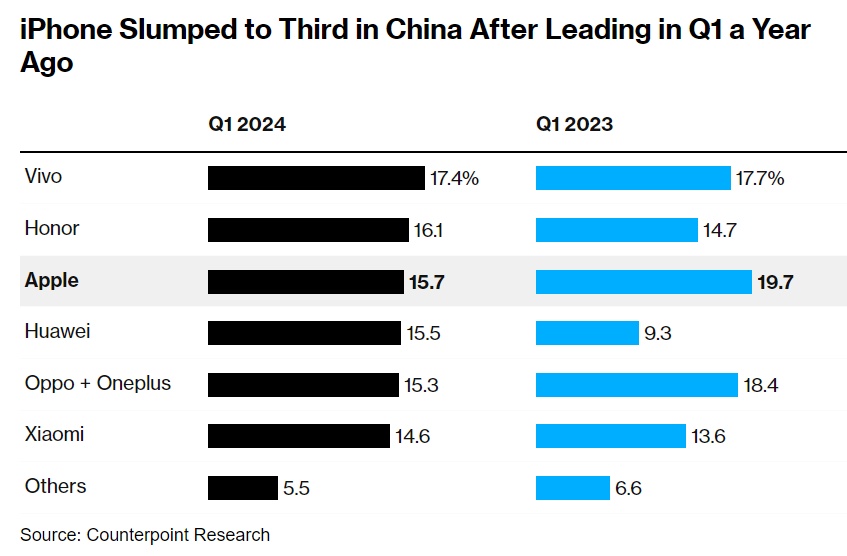 知名独立研究机构Counterpoint Research最新统计数据显示,消费电子巨头苹果截至3月份的第一季度iPhone系列销量在中国市场的同比降幅高达19%,这是苹果iPhone自2020年左右新冠疫情爆发以来在中国市场的单季度最差表现。这家美国科技巨头在竞争激烈的中国智能手机市场上的份额跌至第三位,与中国市场快速崛起的竞争对手华为大致相当。在荣耀以及小米公司等中国本土品牌的引领之下,整个中国智能手机市场在第一季度同比增长约1.5%,连续两个季度实现同比正增长。