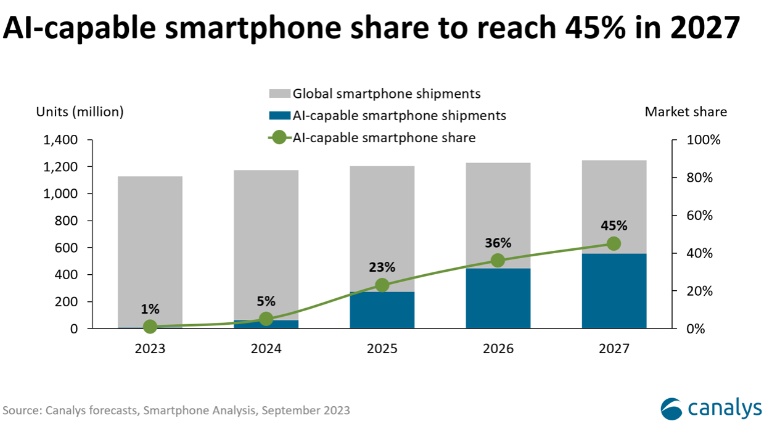 根据市场研究机构Canalys的预测,到2024年,智能手机出货量中的5%将是AI手机,预计到2027年,这一比例将上升至45%。Canalys表示,智能手机行业寻找新增长机会的过程中,各个厂商将导入生成式AI作为优先战略,致力于个性化和以体验为导向的创新。Canalys强调,随着三星发布全新的Galaxy S24 AI智能手机,表明三星对未来的愿景也随之清晰显现:生成式人工智能(GenAI)成为了其长期产品战略不可或缺的元素,特别是在高端和旗舰市场。
