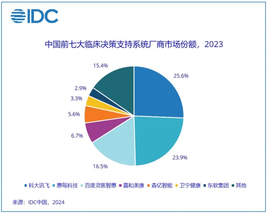 随着市场需求的变迁,市场参与厂商经历了一定时期的洗牌。现阶段国内布局CDSS产品的主要有三大主体,即:医疗信息化厂商、创新医疗科技厂商、互联网科技厂商。基于各类厂商的优势和所面临的挑战不同,当前,各类厂商在产品和市场拓展方面形成了一定的差异,头部厂商率先建立了市场优势,取得了较高的份额。IDC数据显示,2023年临床决策支持系统市场排名前七的厂商市场份额为84.6%。