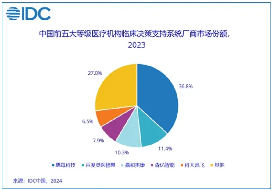 基层医疗机构市场的CDSS分布和应用程度仍处于较低水平,其市场规模相对有限。这一市场头部效应也较为明显,市场份额集中。短期内受到支付能力的影响,基层医疗市场规模增长不如预期。但长期来看,这一市场的增长潜力值得期待。