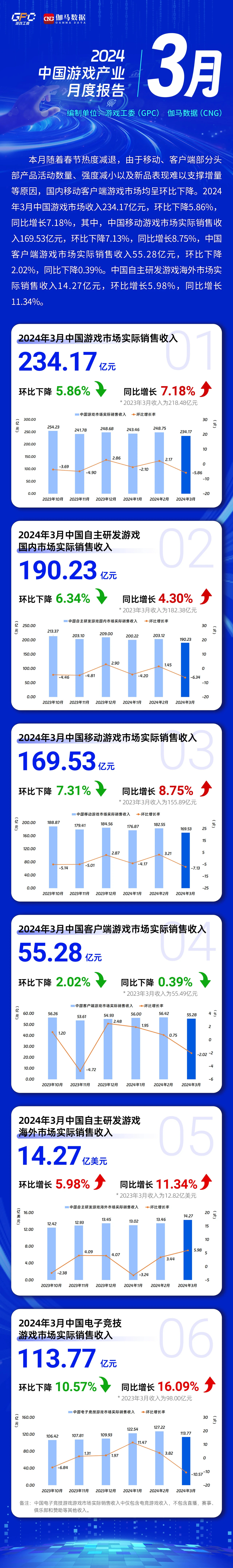 智通财经APP获悉,4月29日,中国音数协游戏工委发布2024年3月中国游戏产业月度报告。报告指出,本月随着春节热度减退,由于移动、客户端部分头部产品活动数量、强度减小以及新品表现难以支撑增量等原因,国内移动客户端游戏市场均呈环比下降。2024年3月中国游戏市场收入234.17亿元,环比下降5.86%,同比增长7.18%。