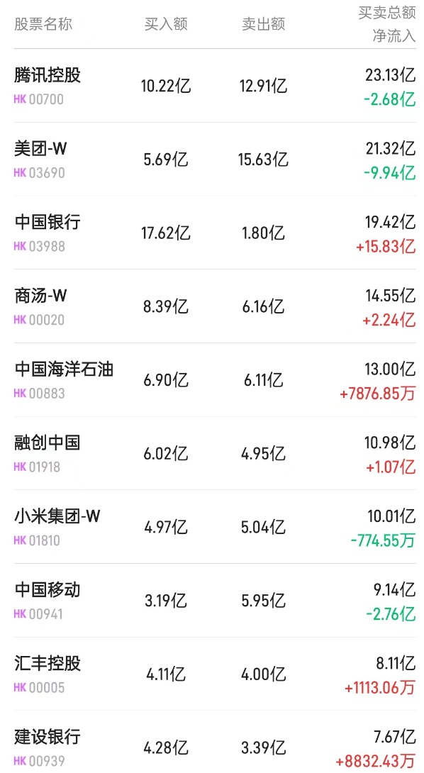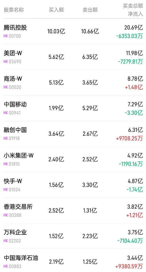 此外,汇丰控股(00005)获净买入1113万港元。而腾讯(00700)遭净卖出3.31亿港元。