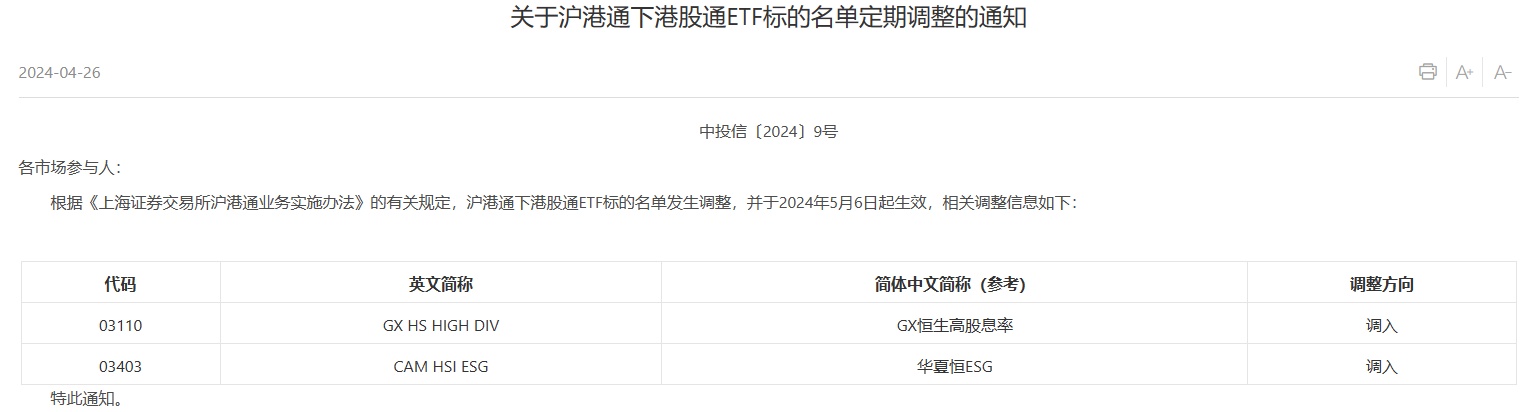 智通财经APP获悉,近日,上交所公布,5月6日起将Global X恒生高股息率ETF(03110) 、华夏恒指ESG ETF(03403)调入沪港通下港股通ETF标的名单,这也是首次有追踪恒生指数、恒生国指和恒生科技指数以外的香港ETF纳入沪深港通,目前纳入港股通的香港ETF增至10家。