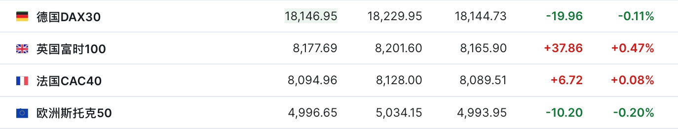 2. 截至发稿,德国DAX指数跌0.11%,英国富时100指数涨0.47%,法国CAC40指数涨0.08%,欧洲斯托克50指数跌0.20%。