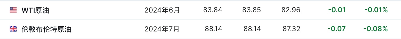 3. 截至发稿,WTI原油跌0.01%,报83.84美元/桶。布伦特原油跌0.08%,报88.14美元/桶。