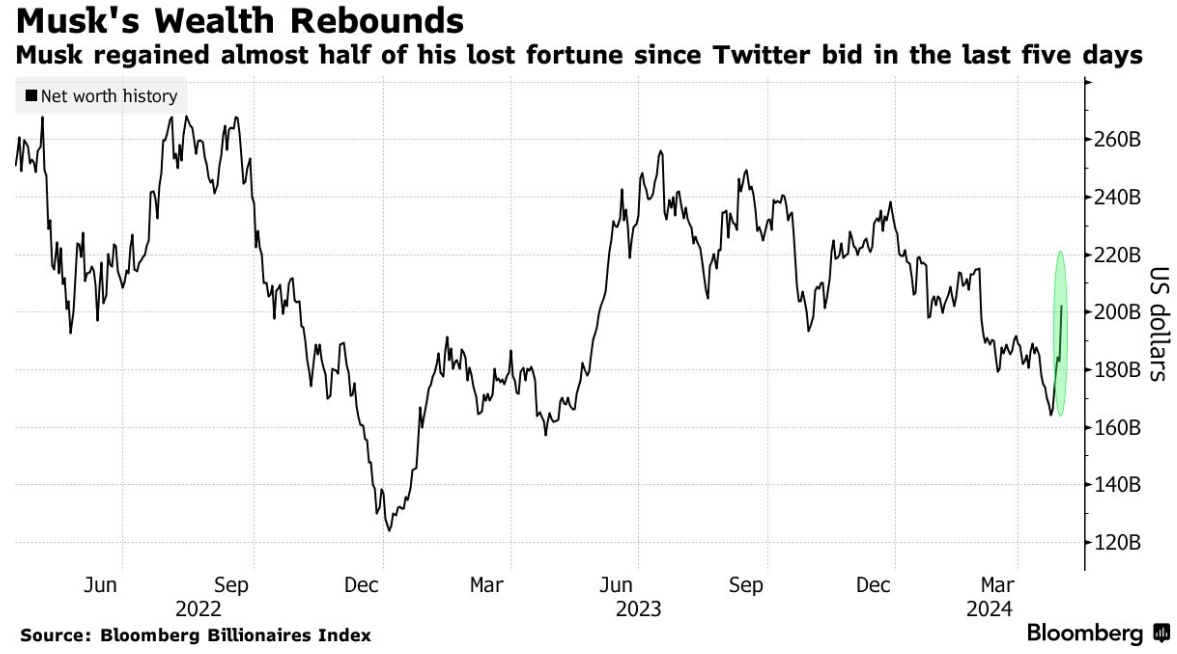 根据彭博亿万富翁指数,过去五天里,这位世界第三富豪的净资产增加了 373 亿美元。这是他自 2022 年 3 月以来的最大单周涨幅,就在他同意以 440 亿美元收购 Twitter 之前,这是历史上最大的杠杆收购交易之一。从那时起,他的财富在 2020 年和 2021 年经历了惊人的上涨后,经常暴跌。