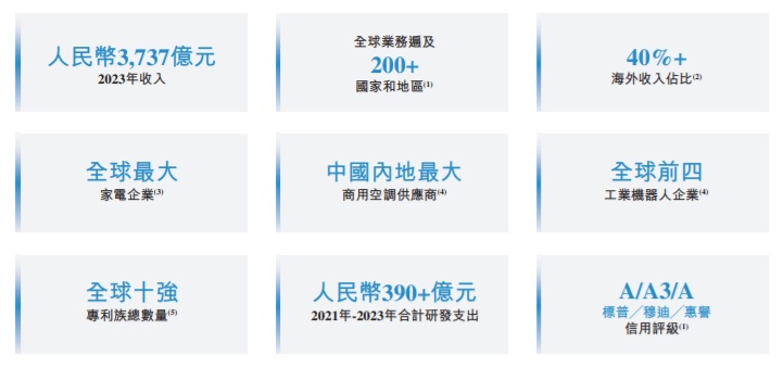 按照2023年销量及收入计算,公司是全球最大的家电企业,按销量计市场份额为7.9%。于2023年,按销量计,在家用空调、洗衣机、冰箱以及厨电及其他家电领域均跻身全球前三名,分别占23.7%、14.2%、10.5%及6.0%的市场份额。同期,按零售额计,公司在这四个领域亦位列全球前三,市场份额分别为21.1%、12.5%、7.7%及4.6%,其中,在家用空调和厨电及其他家电领域位居榜首。
