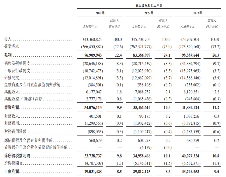 财务方面,于2021年、2022年、2023年,公司实现收入分别为约人民币3433.61亿元、3457.09亿元、3737.10亿元,同期,实现年度利润分别约为290.31亿元、298.12亿元、337.47亿元。
