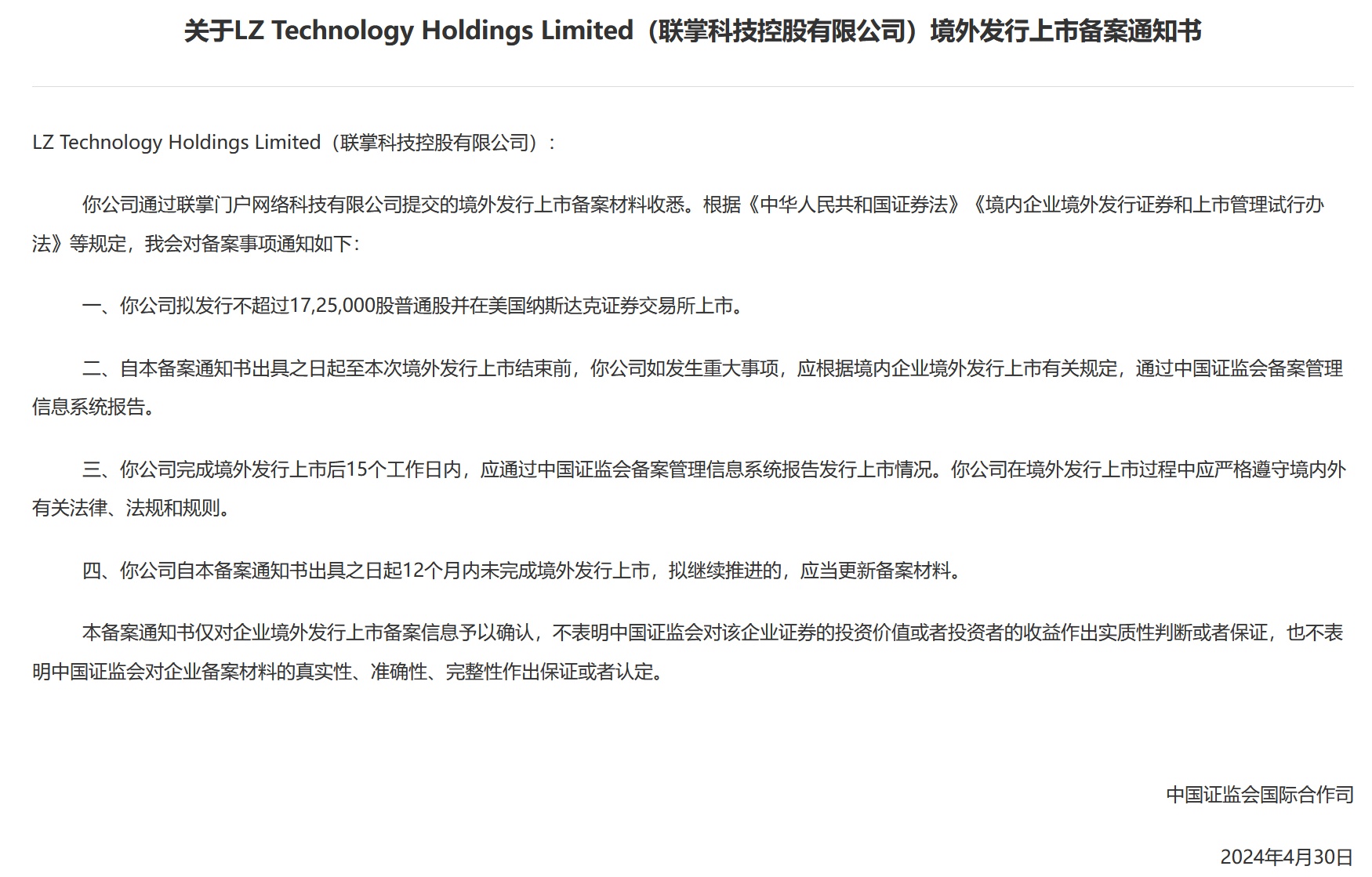智通财经APP获悉,4月30日,中国证监会消息,联掌科技通过联掌门户网络科技有限公司【下称:联掌门户(LZMH.US)】提交的境外发行上市备案材料证监会已收悉。联掌科技拟发行不超过17,25,000股普通股并在美国纳斯达克证券交易所上市。
