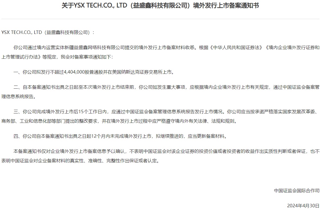 智通财经APP获悉,4月30日,中国证监会发布《关于YSX TECH.CO., LTD(益盛鑫科技有限公司)境外发行上市备案通知书》。益盛鑫科技拟发行不超过4,404,000股普通股并在美国纳斯达克证券交易所上市。