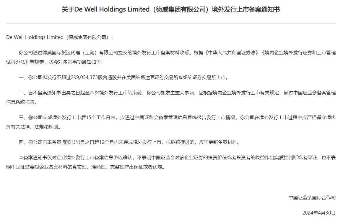 Limited(德威集团有限公司)境外发行上市备案通知书。该公司拟发行不超过299054373股普通股并在美国纳斯达克证券交易所或纽约证券交易所上市。公开资料显示,德威是中国领先的端到端跨境供应链解决方案服务商,主要提供国际货运服务、履约增值服务。