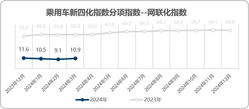 2024年3月网联化指数为10.9,较上月出现明显反弹。