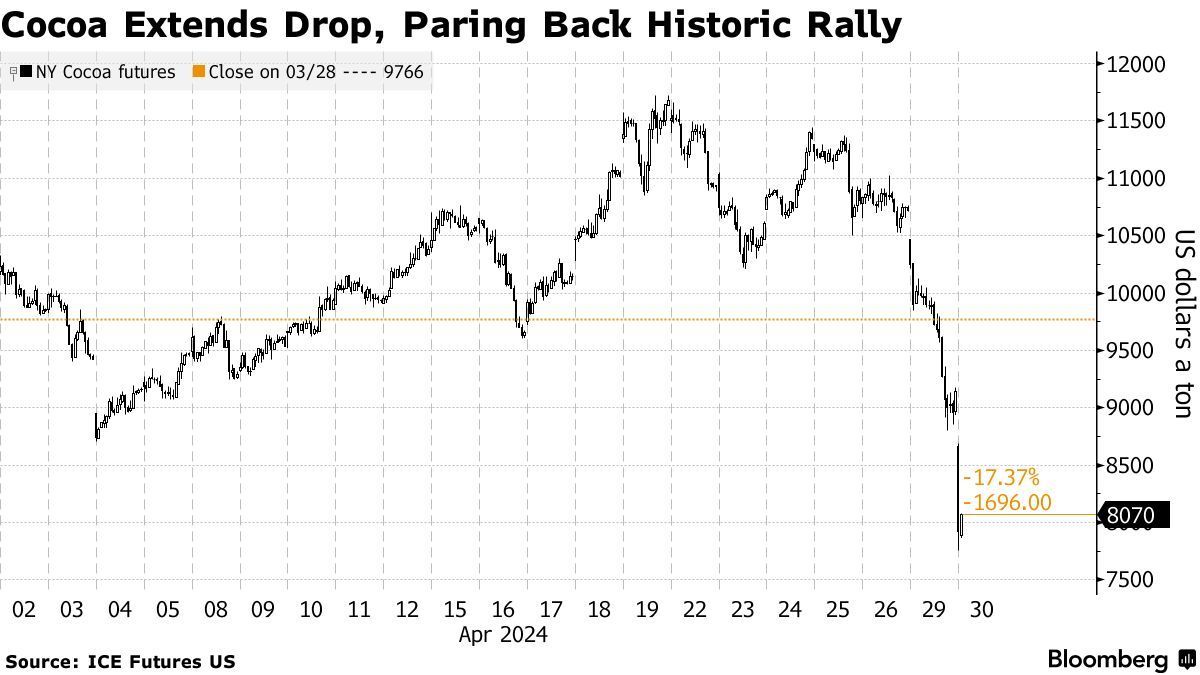 智通财经APP获悉,随着能够维持交易头寸的投资者和公司越来越少,可可价格波动变得更加剧烈,在短短两天内的跌幅高达27%。截至发稿,纽约可可期货价格跌超15%,此前一天的跌幅创下1960年以来的最高水平。可可价格的大幅下跌与本月早些时候的情况形成鲜明对比——历史性的供应紧张在本月早些时候将可可价格推至每吨逾1.1万美元的创纪录水平。