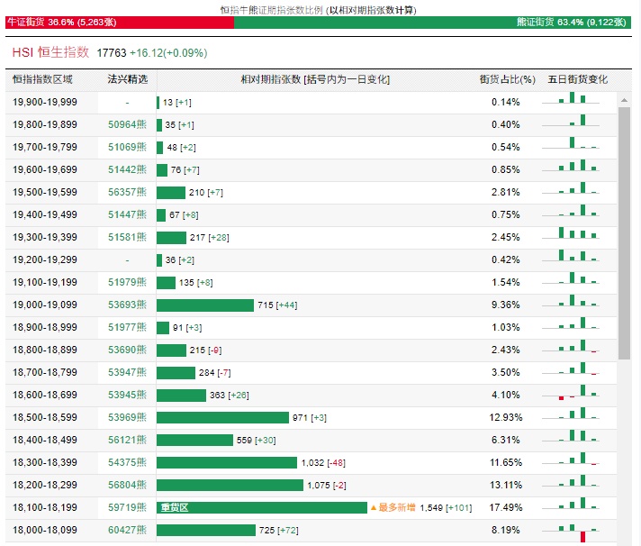法兴恒指牛熊证街货分布图中的数据显示,熊证街货重货区和最多新增都在18100-18199区间,该区间最新熊证数量为1549张,较上一交易日增加101张。