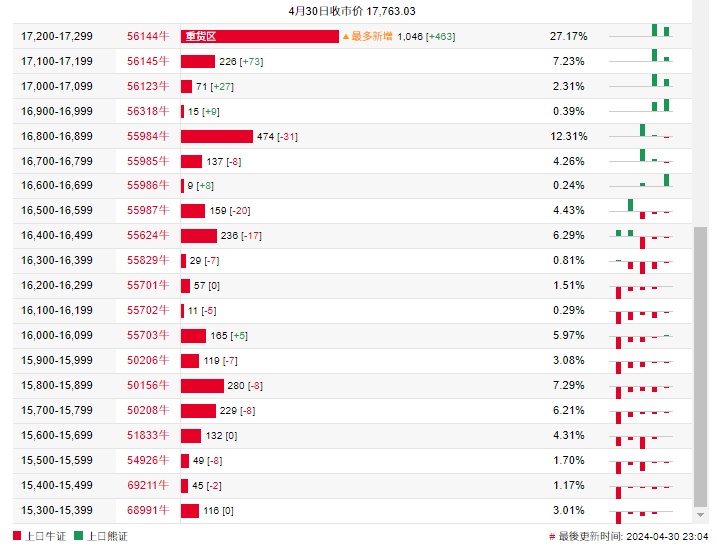 牛证街货重货区和最多新增都在17200-17299区间,该区间最新牛证数量为1046张,较上一交易日增加463张。