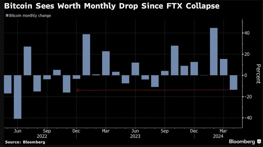 智通财经APP获悉,由于投资者对美国比特币ETF的需求降温,比特币遭遇了自山姆•班克曼-弗里德(Sam Bankman-Fried)的FTX帝国崩溃以来最大的月度跌幅。比特币在4月份下跌了近16%,仅略低于2022年11月的跌幅。美国ETF引发的狂热在3月份将比特币推至近7.4万美元的创纪录高点,但随着对美联储降息预期的减弱,对高风险投资的需求受到打击,流入比特币产品的资金已大幅减少。