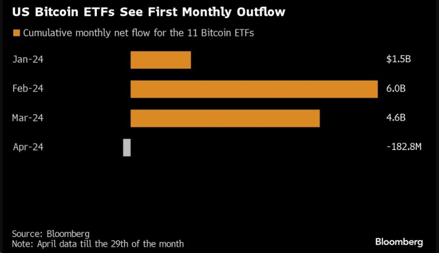 截至4月29日,11只美国现货比特币ETF当月净流出1.82亿美元。这些基金3月份净流入46亿美元。美国证券交易委员会(SEC)今年1月批准了这些基金。