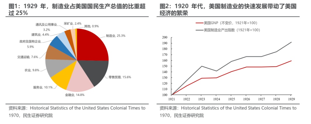在第一次世界大战后,美国在经历了由战时物价管制向经济正常化的扰动之后,进入了被称为“咆哮的20年代”的繁荣时期。在这十年中,制造业的快速发展是美国经济增长的最主要拉动力:从各主要行业产出占美国国民生产总值的占比来看,到1929年时制造业的占比超过了25%。以不变价的美国国民生产总值来看,1921年至1929年间累计增长59%,年化增长率接近6%;而同样是以产出不变价的制造业生产指数来看,1921至1929年美国制造业产出累计增长超90%,年化增长率为8.5%。