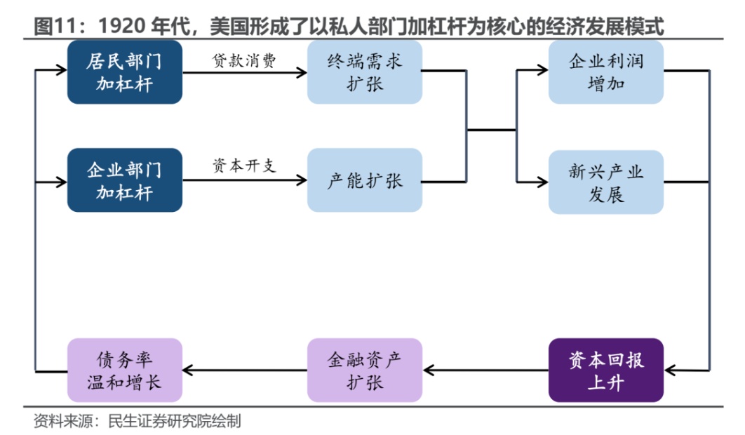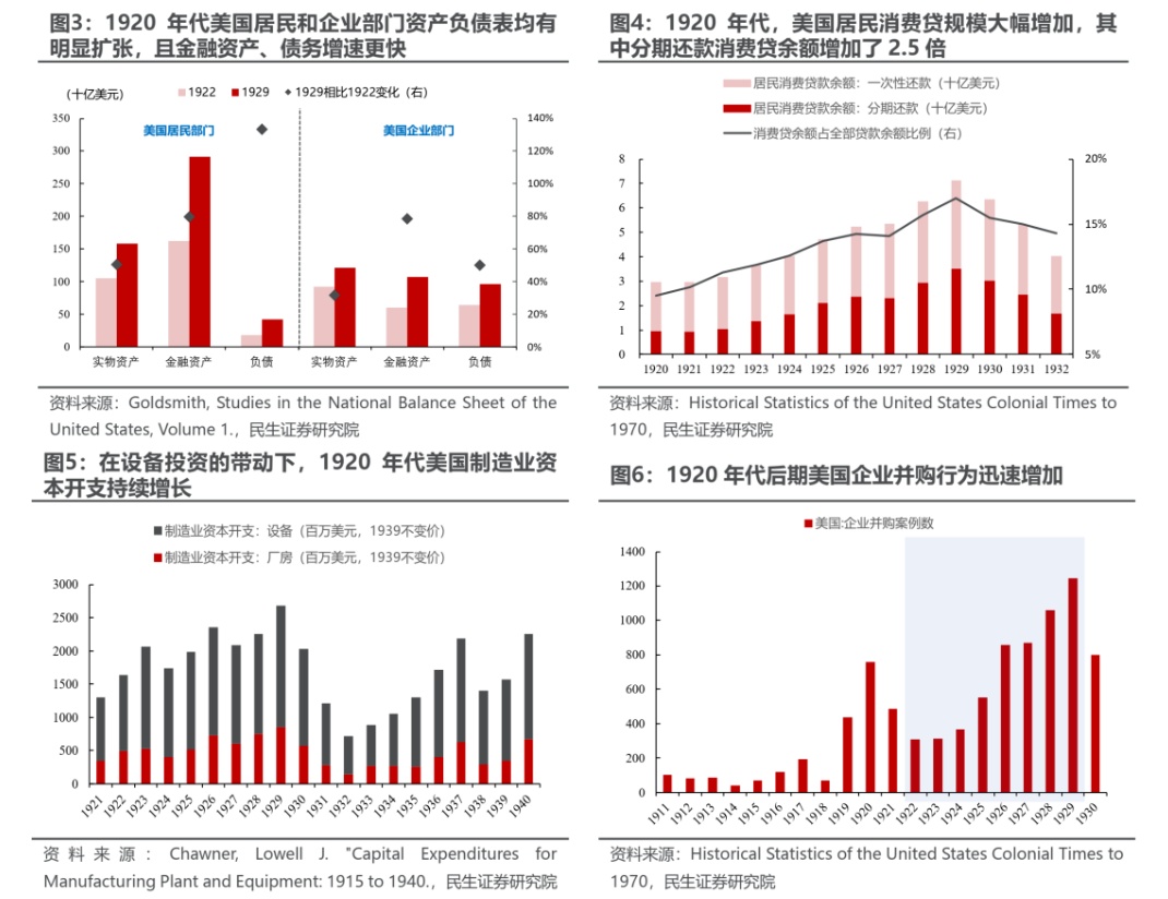 整体来看,1920年代美国形成了以私人部门加杠杆为核心驱动的经济发展模式。居民部门债务增长推动了终端需求的扩张,一方面刺激企业部门加杠杆扩大产能、或是通过并购的方式实现规模效应以获得更多的利润,另一方面也促进了以汽车、无线电为代表的新兴产业的迅速成长。经济的繁荣使得企业端资本回报率上升,在宽松的货币政策和积极的财政政策的环境下金融资产也快速增长。私人部门负债和金融资产的扩张使得美国私人部门的债务率在1920年代只是温和增长,使得居民部门和企业部门的加杠杆意愿持续维持。