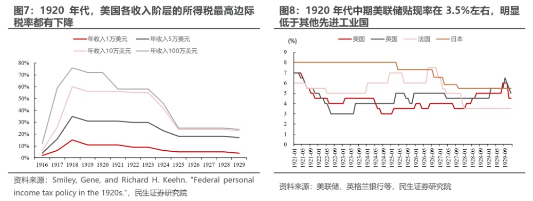 在美国私人部门持续加杠杆的过程中,美国无论是货币政策还是财政政策的基调都是以宽松为主。柯立芝在1923年就任美国总统后,在经济政策的大方向上以自由放任为指导思想。就财政政策来说,柯立芝在任内极力推动减税政策,美国所得税的最高边际税率由一战刚结束后的73%一路下行至25%。在柯立芝不寻求连任、胡佛赢得大选上台之后,进一步将边际税率下调至24%,并且提出了“每个家庭锅里都有一只鸡,车库里有两辆车”的口号。与此同时,在自由放任思想的指导下,美联储也执行宽松的货币政策,美联储的贴现率水平在1920年代中期维持在3%-3.5%的水平,显著低于当时的先进工业化国家。