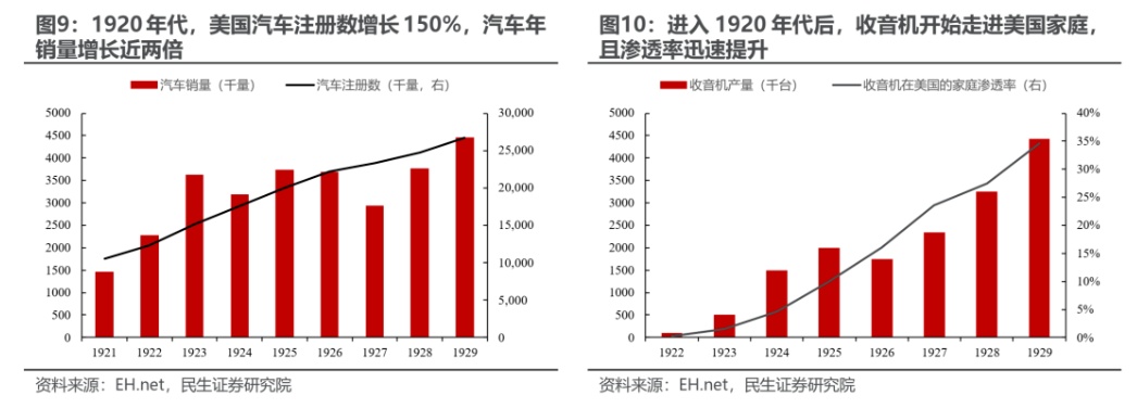 与此同时,科学技术进步与工业制造的结合也推动了新兴产业渗透率的快速提升。20世纪初至一战前的美国被称为“进步时代”,以无线电、内燃机为代表的前沿科技理论进一步完善,但从科技理论到可商业化的产品仍然有着不小的距离。到了20世纪20年代,科学技术与生产工艺更好地结合起来,汽车制造、无线电通讯等新兴行业迅速发展。1921至1929年,美国汽车注册量由1000万辆上升至2600万辆,汽车销量也由不足150万辆上升至近450万辆。与此同时,以收音机为代表的无线电产品在美国的渗透率快速提升:1920年代初时美国家庭几乎没有收音机,而到了1929年时收音机的家庭普及率以达到35%。