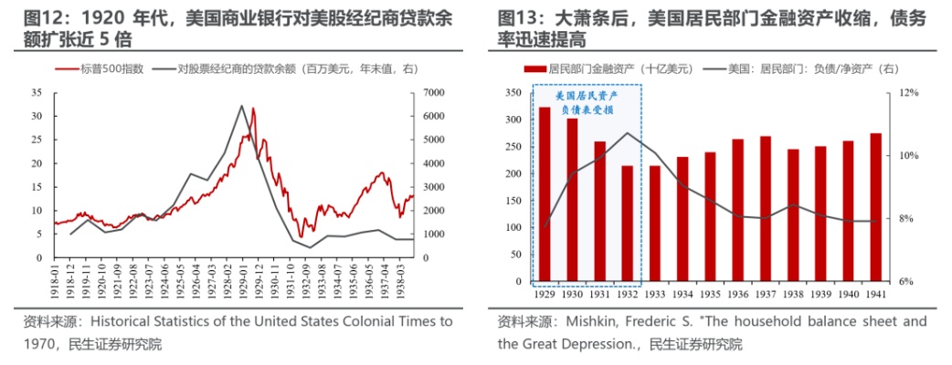 1920年代美国以私人部门加杠杆为驱动的经济发展模式中,金融资产的过快增长正是其隐忧所在。1920年代后期,美国股市持续繁荣使得美股投资者产生了过度乐观的情绪,费雪定律的提出者欧文·费雪甚至在1928年提出“股市到了永不下跌、永远上涨的时代”。在这种过度乐观情绪的驱使下,美股的投机交易也愈发广泛,在金融市场内杠杆交易迅速扩张:美股交易者如果要进行杠杆交易, 那么就需要从股票交易所登记的经纪商处进行融资,而股票经纪商的融资则来自于银行的贷款;1920年初至1929年高点标普500指数上涨约3倍,而美国银行系统对证券经纪商的贷款余额则扩张了近5倍。
