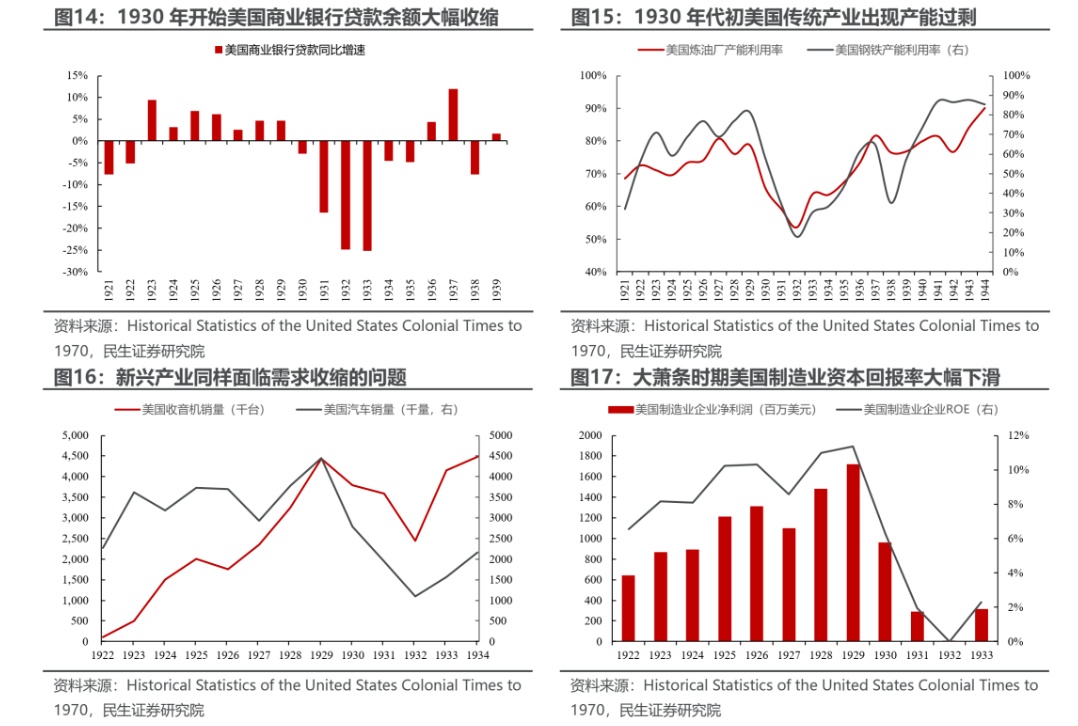 美国居民部门由加杠杆转向去杠杆,导致终端需求由扩张转向收缩,进而使得美国制造业出现产能过剩过剩的现象。传统产业中,美国铁锭生产商的产能利用率在1920年代的平均水平在80%左右,然而在大萧条期间一度下降至不足20%;炼油厂产能利用率同样出现了明显的下滑。与此同时美国的新兴产业同样面临需求收缩带来的影响,1932年美国汽车销量不到1929年的25%,收音机销量同样也下滑了近50%。随着经济运行模式由加杠杆转向去杠杆,美国制造业的资本回报率也从经历了大幅的下降。在1920年代的加杠杆时期,美国制造业公司的ROE水平逐步由6.5%上升至11.4%;然而在大萧条的去杠杆时期,美国制造业公司的ROE在1932年时一度降低到只有0.5%。