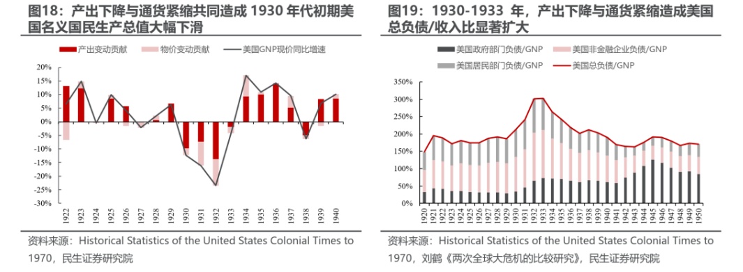 1920至1929年间,美国居民部门的分期消费贷款余额增长了2.5倍,企业部门每年以不变价计算的资本开支扩张了1倍,而金融资产的扩张则缓解了美国私人部门债务率的增长。居民与企业部门持续加杠杆促进了供给与需求的扩张,企业资本回报增加推升金融资产价格并压低了负债率的增长,由此形成了美国在1920年代以加杠杆为核心的经济发展模式。1920年代美国银行系统对股票经纪商的贷款余额扩张近5倍。美国金融市场泡沫在1929年末破灭后,金融资产价格的下跌造成美国私人部门资产负债表恶化,负债率的过快提升导致美国开启了去杠杆进程。终端需求的萎缩使得美国的传统产业还和新兴产业均出现了产能过剩的问题。严重的供求不平衡一方面降低了美国企业部门的资本回报,另一方面造成了美国物价持续下行。通缩环境加剧了名义产出的收缩,使得负债/收入比持续上升并降低美国私人部门加杠杆的意愿。而与此同时,由企业经营状况严重恶化形成了大量坏账,美国银行部门的资产质量也严重恶化,客户的挤兑压力上升,作为资金供给方的银行部门同样有着降低负债、补充资本的诉求。值得一提的是,在1932-1933年一段时间,由于更严重的产能过剩与通缩压力,出现过全球主要工业国股票反弹,但美股却在底部震荡的反差情形。
