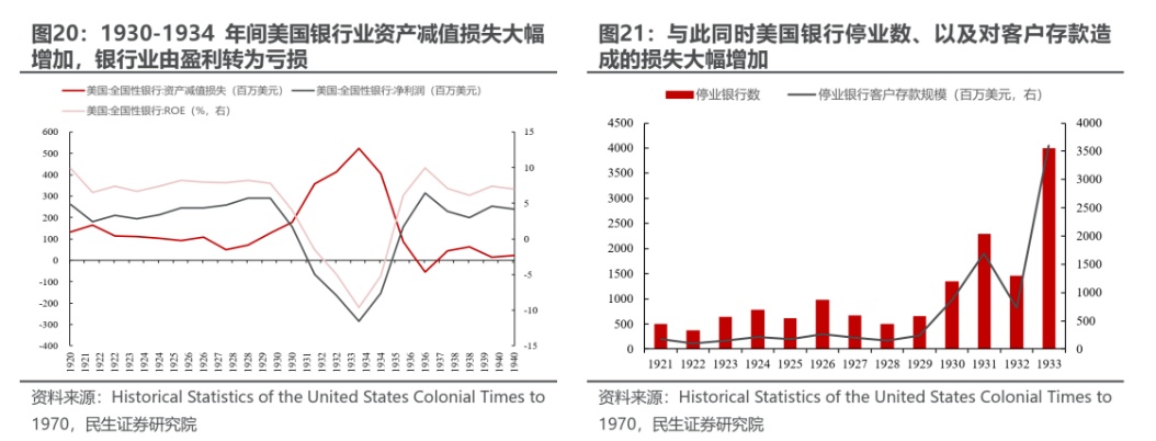 大萧条时期,在私人部门这一曾经的资金需求方进行去杠杆之时,作为资金供给方的银行部门同样有着降低负债、补充资本的诉求。受金融资产价格大幅下降、企业部门盈利下降导致坏账出现等因素的共同影响下,美国银行业的资产减值损失从1930年开始显著增加,导致美国银行业由盈利转为亏损、ROE由1920年代的平均水平8%下降至-10%。由于商业银行资产质量出现严重恶化,在存款保险制度尚未建立的情况下,美国地区性小型银行也面临着较大的挤兑压力。1929至1933年间,美国的年停业银行数由650逾家上升至4000家以上,受影响的客户存款规模则增加了约15倍。