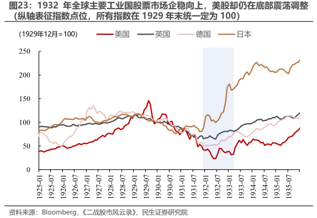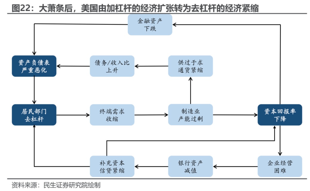 整体来看,大萧条后美国经济由1920年代私人部门加杠杆推动的持续扩张转为去杠杆压制下的经济紧缩循环。金融资产价格的大幅下跌导致居民部门资产负债表恶化,负债率的过快上升导致居民部门开始去杠杆的进程,由此在实体经济领域造成终端需求的收缩与生产端的产能过剩。严重的供给过剩一方面造成了通货紧缩,在经济收缩的情况下进一步降低了名义产出,使得债务/收入比继续上升,进而加剧了居民部门的负债压力;另一方面导致企业端资本回报率下降、企业经营困难,在金融市场形成的结果是金融资产价格继续下行,银行系统计提大量资产减值。由于银行业资产质量下降,居民的挤兑压力使得商业银行收紧信贷以补充资本,资金供给端的收缩既加剧了居民部门去杠杆的程度,也使得企业部门更难获得信贷,放大了企业经营的困难程度。值得一提的是,由于美国面临着严重的产能过剩和通缩压力,在1932年全球主要工业国股票市场已经企稳向上时,美股却仍在底部震荡调整。