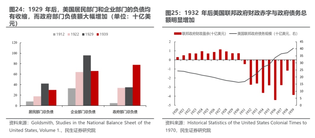 在美国居民部门和企业部门持续缩减资产负债表形成去杠杆的恶性循环后,美国政府从1930年代中期开始成为加杠杆的主要力量。从国家资产负债表的视角来看,大萧条后美国私人部门大幅降低负债,而政府部门的总负债规模却有明显的扩张。在1920年代的繁荣时期,美国政府长期对经济活动采取自由放任的态度,在财政政策上非常强调“平衡预算”的思想,美国联邦政府持续产生财政盈余。然而由去杠杆所引发的经济恶性循环持续发酵,当经济下行对民众生活造成的影响愈发难以承受时,美国政府也开始意识到需要主动对经济活动进行干预以缓解经济下行带来的影响。特别是在1933年富兰克林·罗斯福就任美国总统之后,美国联邦政府的财政支出大幅增加,同时联邦政府的债务规模也右明显的增长。1932至1936年间美国联邦政府财政支出规模由42.7亿美元大幅增加至91.7亿美元,同期联邦政府债务规模则是由195亿美元扩大至338亿美元。