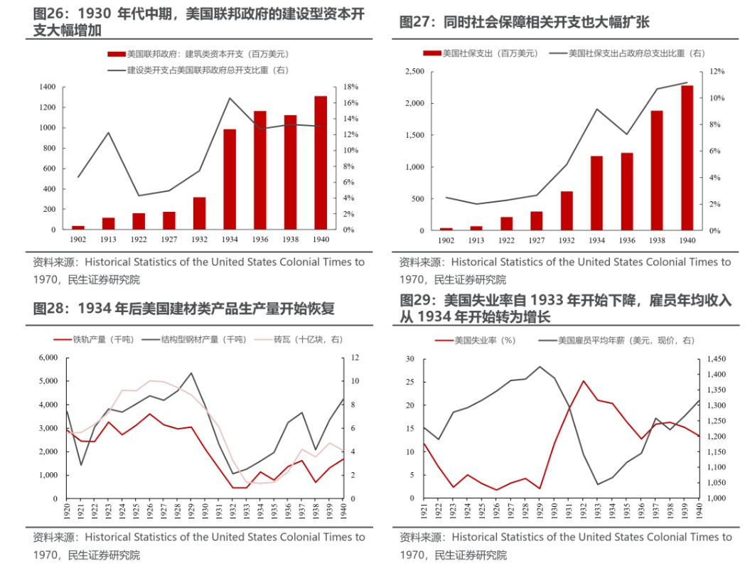 比较胡佛时期和罗斯福时期美国政府的政策来看,胡佛政府主动采取的政策更侧重于金融侧,而罗斯福政府的政策则更关注于对实物需求的拉动。对比1932年(胡佛总统任期的最后一年)和1934年美国联邦政府的财政支出来看:美国联邦政府的财政赤字由27.4亿美元增加至36.3亿美元,扩张约33%;但用于建设类形成实物工作量的财政支出则是由3.2亿美元增加到了9.8亿美元,是1932年水平的3倍有余。