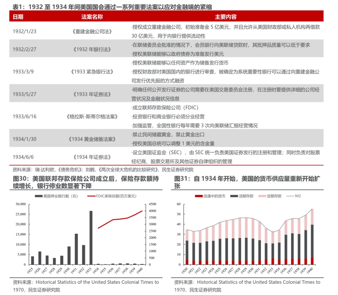 面对金融部门持续收缩信贷、补充资本以降低杠杆的情况,在美国政府的主导下,美国国会在1932至1934年间出台了一系列法案,从三个方面加以应对: