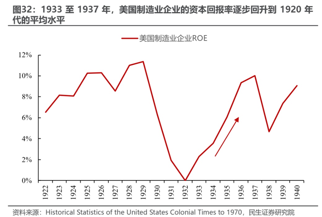 美国政府部门通过对经济活动的大规模干预,在三个关键节点打破了私人部门去杠杆造成经济持续紧缩的恶性循环:第一,政府部门通过加杠杆、加大基础设施建设的方式扩大总需求,缓解了钢铁等行业所面临的产能过剩问题。美国工业企业整体产能利用率在1932年时不足50%,而到1937年时已恢复至80%。第二,政府部门通过扩大就业、保障劳动者权益等手段,一方面稳定了居民对未来收入的预期,另一方面支持了雇员薪酬的回升,降低了居民部门当前和预期债务收入比;第三,美国政府通过流动性支持和加强监管等手段,增强了居民对银行业的信心、减小银行的挤兑压力,使得银行作为全社会的资金供给方有意愿为经济活动提供信贷支持。在美国政府主导的稳杠杆进程中,美国制造业的资本回报率也企稳回升。到1937年时,美国制造业的资本回报率已回升至10%,但仍低于1920年代的水平。