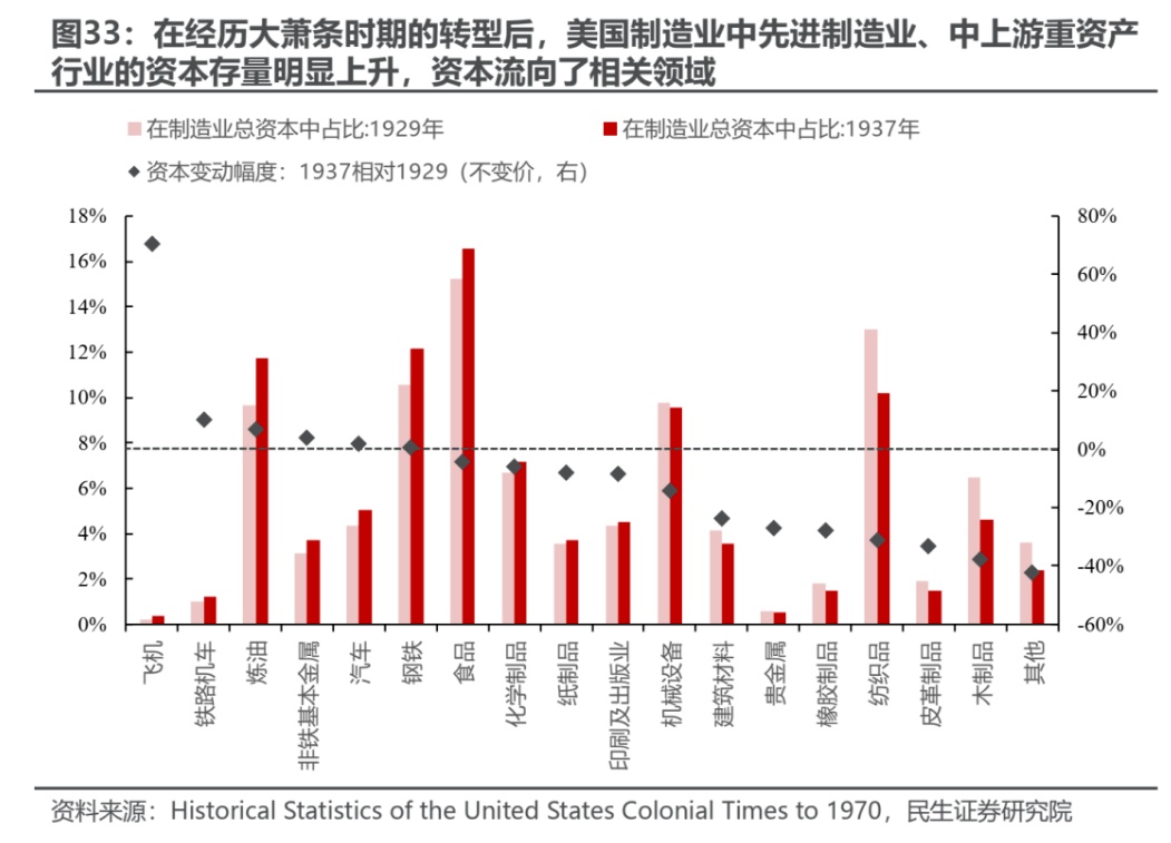 值得投资者注意的是,在经历了快速去杠杆的阵痛期和政府主导的稳杠杆时期后,美国的产业结构也在悄然发生变化。资本密集型的制造业开始变得更为强大,而低技术水平的劳动密集型产业逐步被淘汰。从1929年至1937年美国各行业资本存量的变化来看:飞机制造、汽车制造为代表的高科技产业的资本存量均有抬升,同时钢铁、炼油等中上游重资产行业的资本存量在经历去杠杆的调整期后仍有所提升;而以木制品业、皮革制品业、纺织业为代表的低技术劳动密集型产业的资本存量在去杠杆时期大幅下降,这三个行业资本存量的收缩幅度都在30%以上、在制造业总资本存量中的占比也明显降低。
