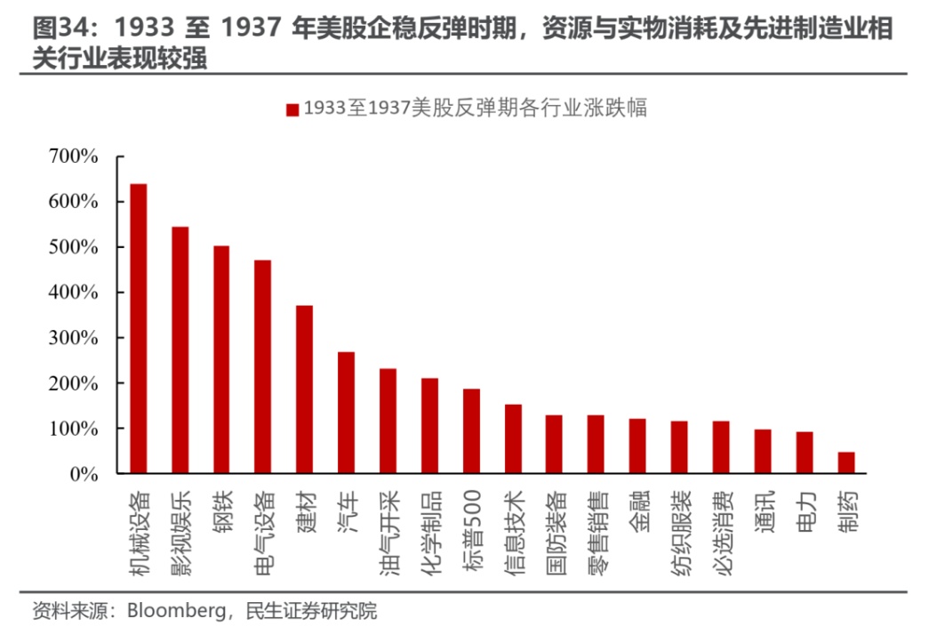 同期美国股票市场也呈现出资源与原材料及先进制造业表现占优的特征。随着去杠杆循环逐步被遏制,美国股市在1933年中至1937年中企稳后逐步回升。分行业表现来看,钢铁、建材、油气开采为代表的上游资源品行业相对标普500指数均有超额收益;同时机械设备、汽车等技术含量较高的中上游制造业也有明显的上涨;而下游行业中,除影视娱乐业涨幅较大外,其他行业虽也有上涨但均没有跑赢市场。