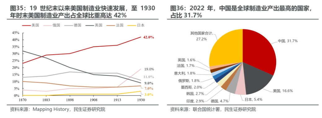 当前,中国同样是全球最大的制造业产出国,2022年中国制造业产出占全球总产出的比重达到31.7%;但是在一些高端制造领域仍然面对卡脖子的隐患,相较于欧美发达经济体仍有追赶空间。同样的,“缺乏自主”研发创新能力也是很多投资者的担忧和部分观点中对中国产业结构的诟病。更广泛的维度看,中国在国际政治格局中仍然是追赶者的角色,在许多领域似乎看起来并不如西方世界具有某种“主导权”。在部分投资者对上述问题表示担忧的同时,不应该忘记一个事实:秩序决定了分工,正是因为秩序的存在决定了一些“不足”的客观存在。但是不应该忘记,正视问题才会更有利于自身的优势的发挥,才会为国家的进一步强大作好准备。