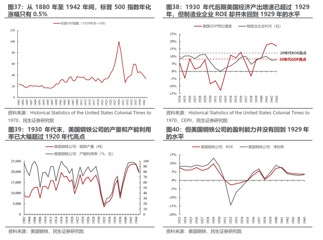 1930年代中期的美国没有过多“消费”刺激,反而是政府通过加杠杆形成实物工作量:同样是以创造更强大供给的方式阶段性托底需求。我们发现:相较于1920年代,1930年经济复苏时期单位GDP的增长同样面对了更低的企业资本回报。我们年度策略中的“不等式”在90多年前那个重新脱虚向实的制造业大国中就已经出现。而这一切的意义,将在1941年后呈现在世人的眼前。