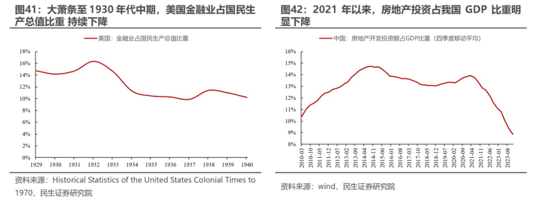 同处金融去杠杆的阶段,是当前我国与大萧条时期美国的相似之处。美国私人部门的金融资产在1920年代大幅扩张,但在美股大幅下行后也出现了明显的缩水,美国金融业占国民生产总值的比重由1929年的14.8%下降至1936年的10.3%。而就当前中国来说,我们在年度策略《诺亚方舟》中指出:2010年后,中国进入了由地产驱动的的经济发展模式,开启了金融化的过程;然而,当前中国经济的发展模式正在由地产为驱动转变为制造业驱动,去金融化是当前中国经济基本面变化的主线。